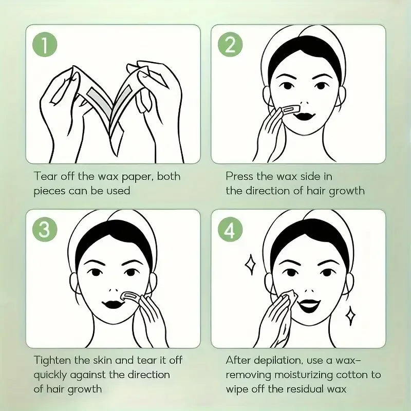 These ready-to-use strips make hair removal simple—no heating, melting, or mess. Just warm the strip between your hands, apply it to the desired area, press firmly, and pull quickly to reveal silky, fresh skin. Perfect for busy routines, travel, and last-minute touch-ups, they help you achieve smooth results anytime and anywhere.