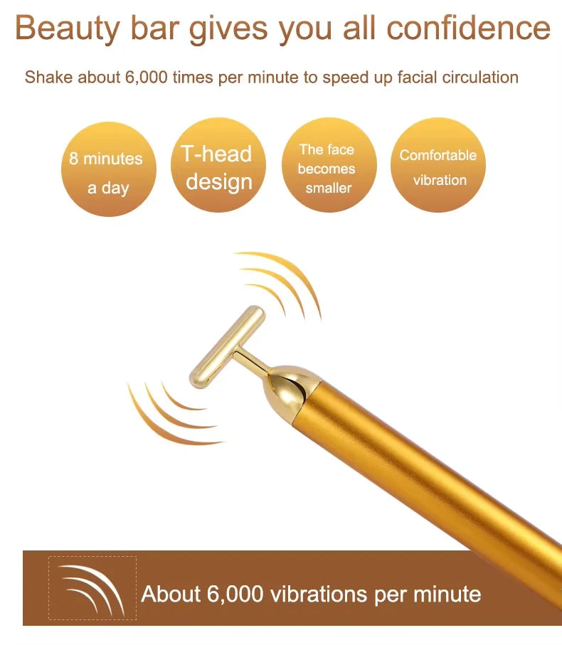 ✅ Type: Vibrating facial lift beauty bar ✅ Technology: High-frequency micro-vibrations ✅ Functions: Lifting, firming, contouring, tightening ✅ Design: T-shaped golden massage bar ✅ Benefits: Enhances absorption, improves elasticity, reduces puffiness ✅ Power: Battery-operated ✅ Use Areas: Face, jawline, neck ✅ Skin Types: Suitable for all skin types