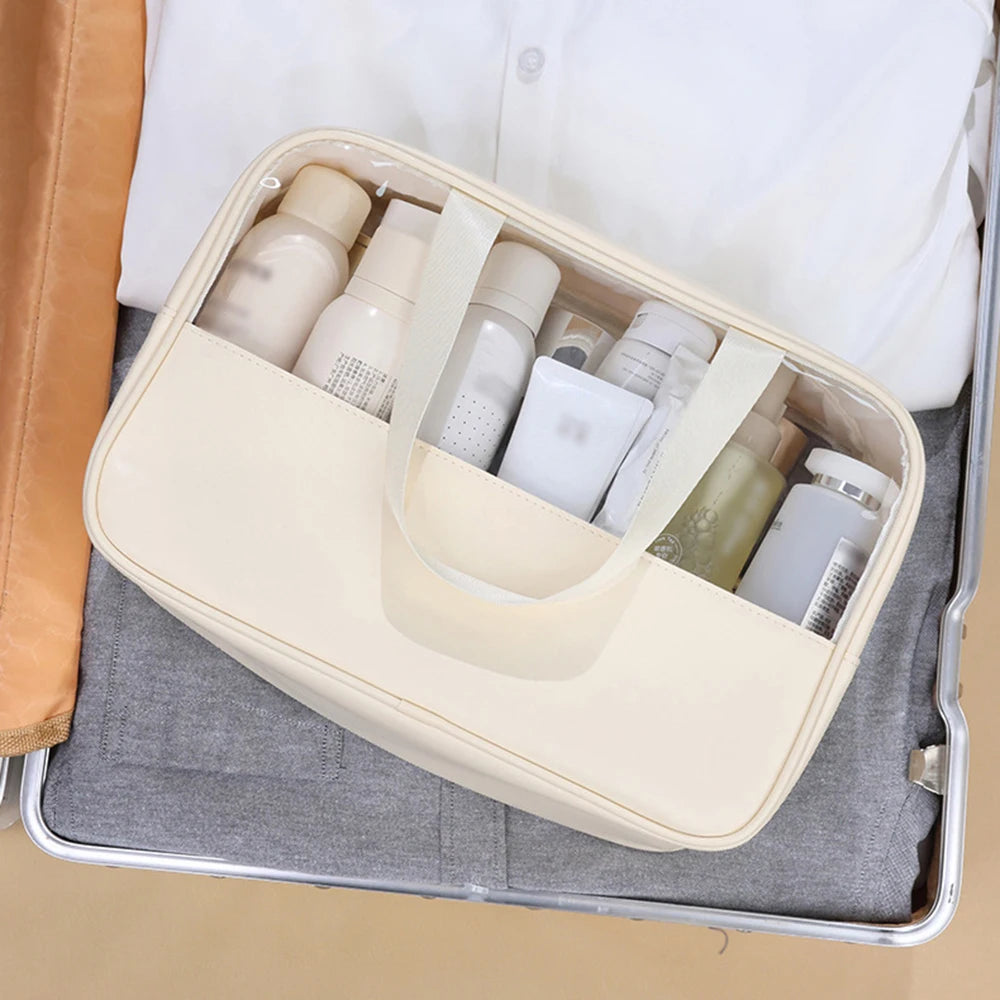 ⭐ Key Features 💠 Waterproof PVC material for full protection 💠 Transparent body for easy visibility 💠 Large capacity with lightweight design 💠 Portable travel-friendly structure 💠 Stylish beige trim for a modern look